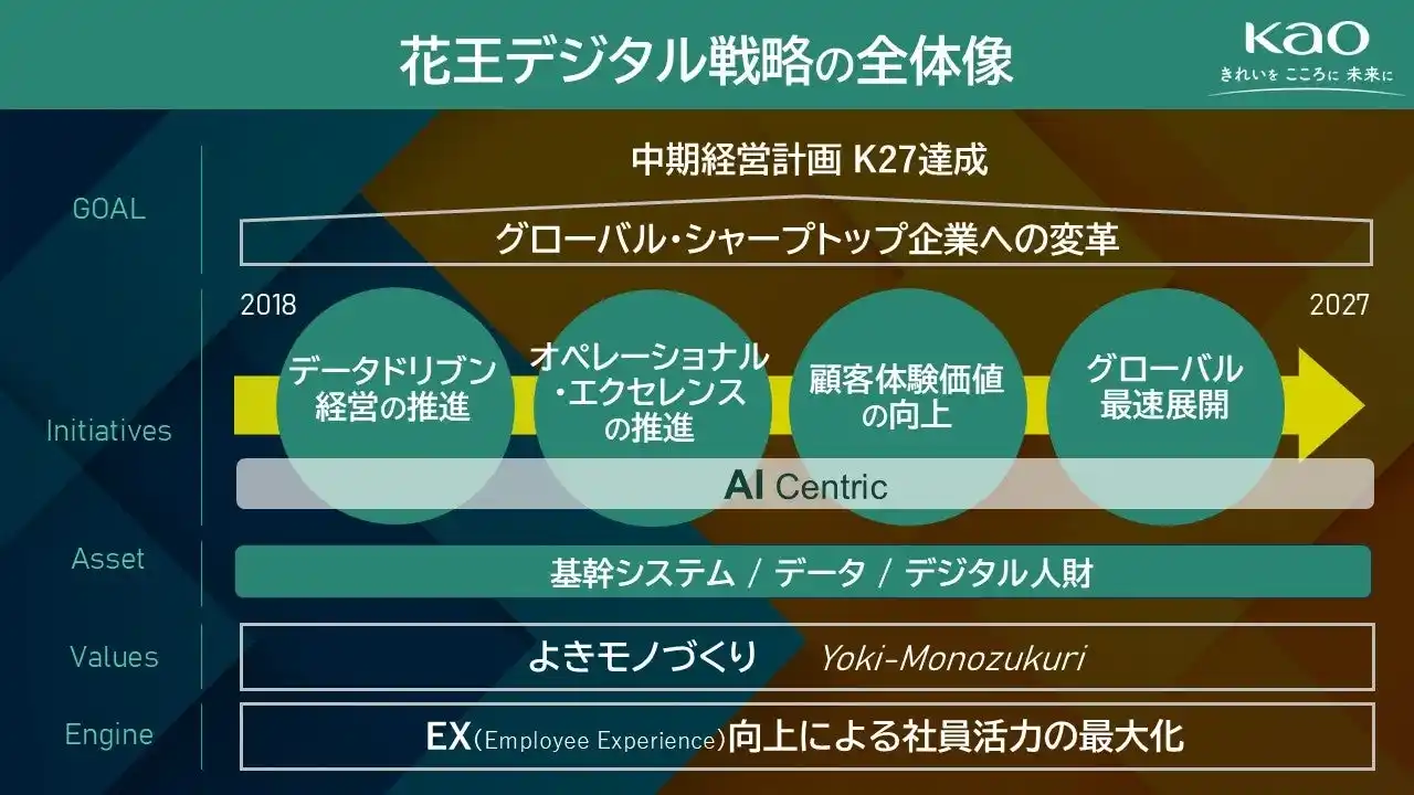花王では、中期経営計画「K27」の達成に向けて、「グローバル・シャープトップ*1」戦略を推進しています。DX推進とAIの活用を中核に、企業活動を支える「よきモノづくり」を高速化するとともに、生活者の“いま”を的確に捉えた商品設計から生産、販売、さらには生活者への還元をめざしています。また、DX推進の取り組みが、花王の主要な経営指標であるROICの改善にどのように貢献するかを検証し、経営とデジタル戦略の統合を推進しています。今後も、データおよびAIの活用を通じて、顧客体験の向上と業務効率化を両立させることで、持続的な企業価値の向上をめざします。 |