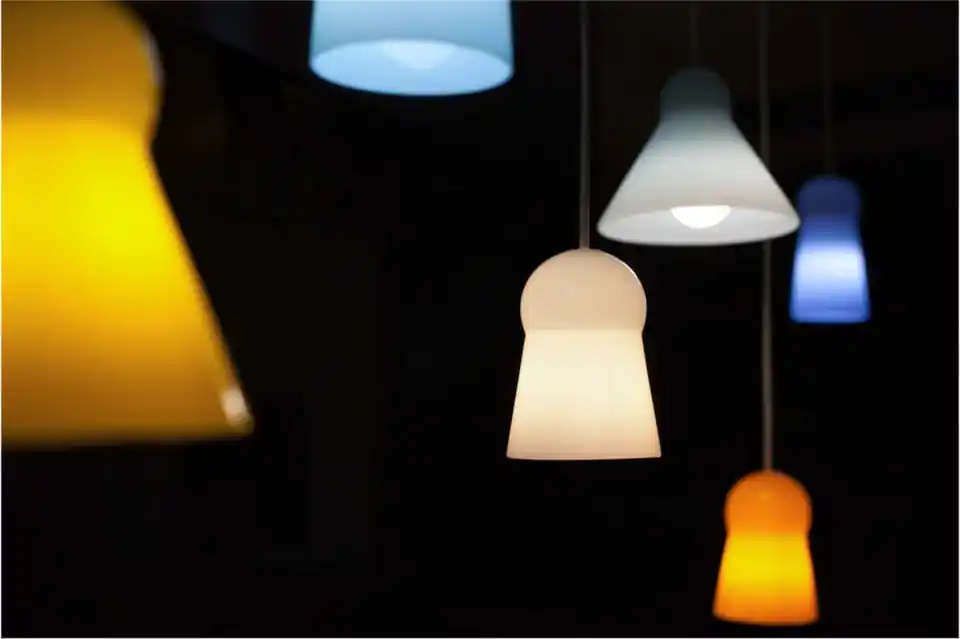 ●会場の照明はガラス作家・高橋禎彦さんのランプシェードです。 |