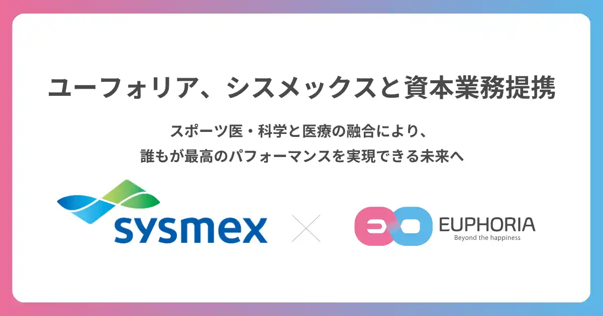 スポーツテック企業の株式会社ユーフォリア(本社:東京都千代田区、代表取締役:宮田 誠・橋口 寛、以下 ユーフォリア)は、シスメックス株式会社(本社:兵庫県神戸市、代表取締役社長:松井 石根、以下 シスメックス)と、ヘルスケアおよびスポーツ領域における資本業務提携を締結いたしました。 |
