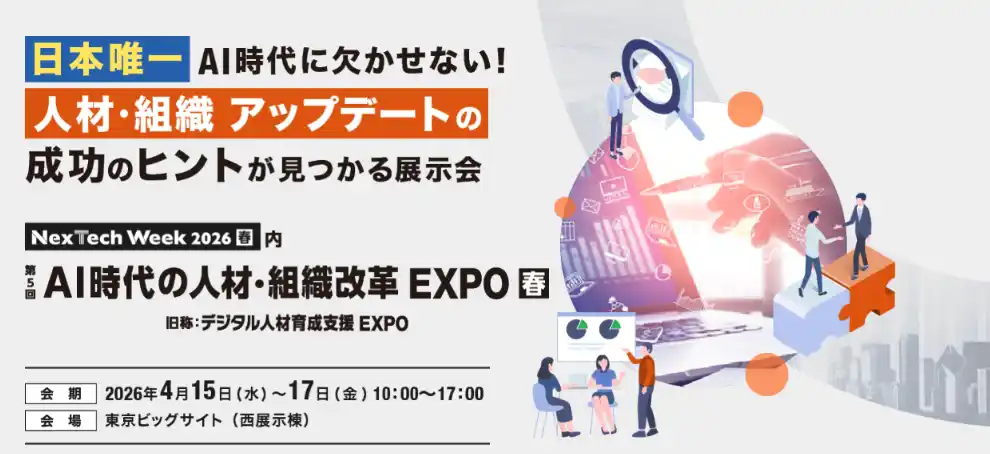 「AI時代の人材・組織改革EXPO【春】」では、リスキリング支援やAI・生成AI人材育成に加え、給与・人事制度・働き方の見直し、さらには人的資本経営の高度化を支えるサービスも集結。AI時代に求められる人と組織の進化を、具体的に比較・体感できます。 |