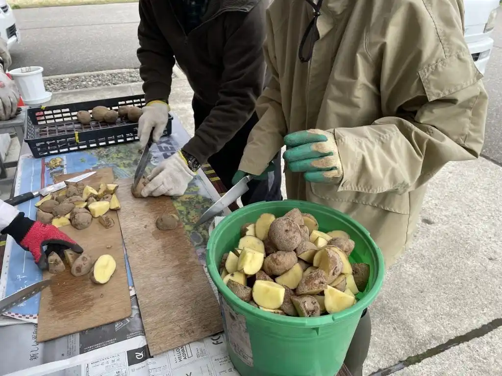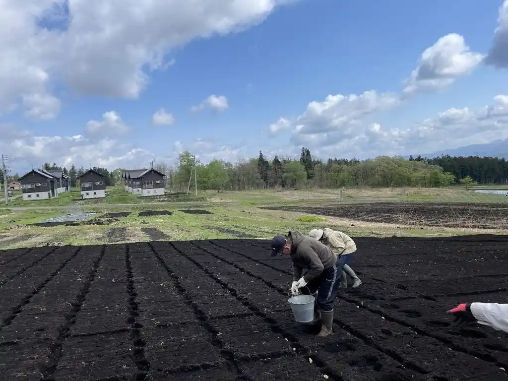 | 地元・大洞原の農家の方と一緒に、じゃがいもを土に植えます。長靴を履いて、泥だらけになりながら挑戦する体験は、都市部ではなかなかできない貴重な時間。 | ||||