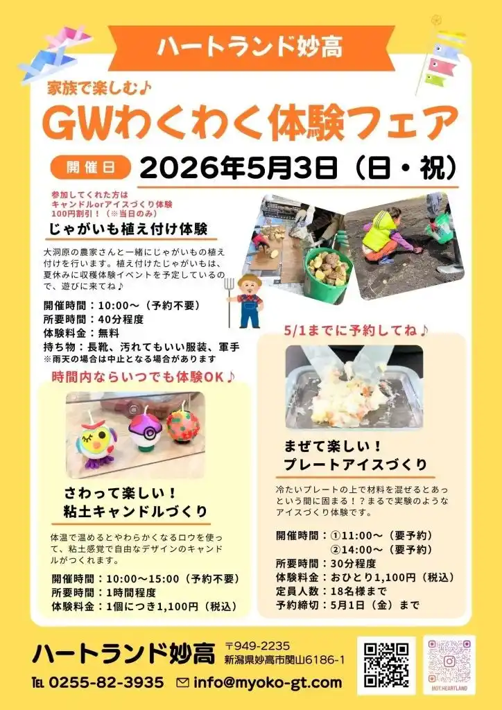 | 2026年5月3日(日・祝)、新潟県妙高市のハートランド妙高にて「GWわくわく体験フェア」を開催します。 | ||||