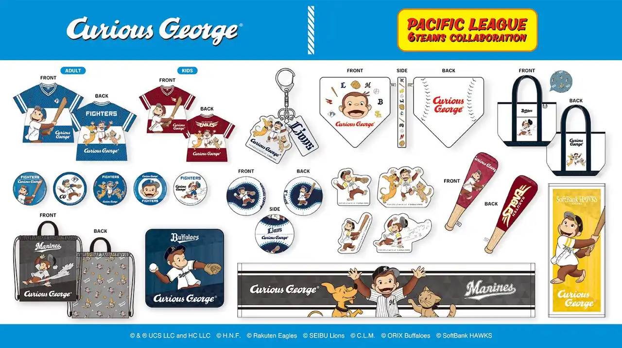 グッズ開発メーカーの株式会社ヒューネット(本社:愛媛県松山市)は、誕生85周年を迎える「おさるのジョージ」とパ・リーグ6球団によるスペシャルコラボグッズを企画・開発いたしました。2026年4月24日(金)より、各球団の公式ショップ、おさるのジョージ公式ショップ、オンラインストアにて順次発売を開始致します。(発売開始時期は各店舗で異なる場合があります。) |