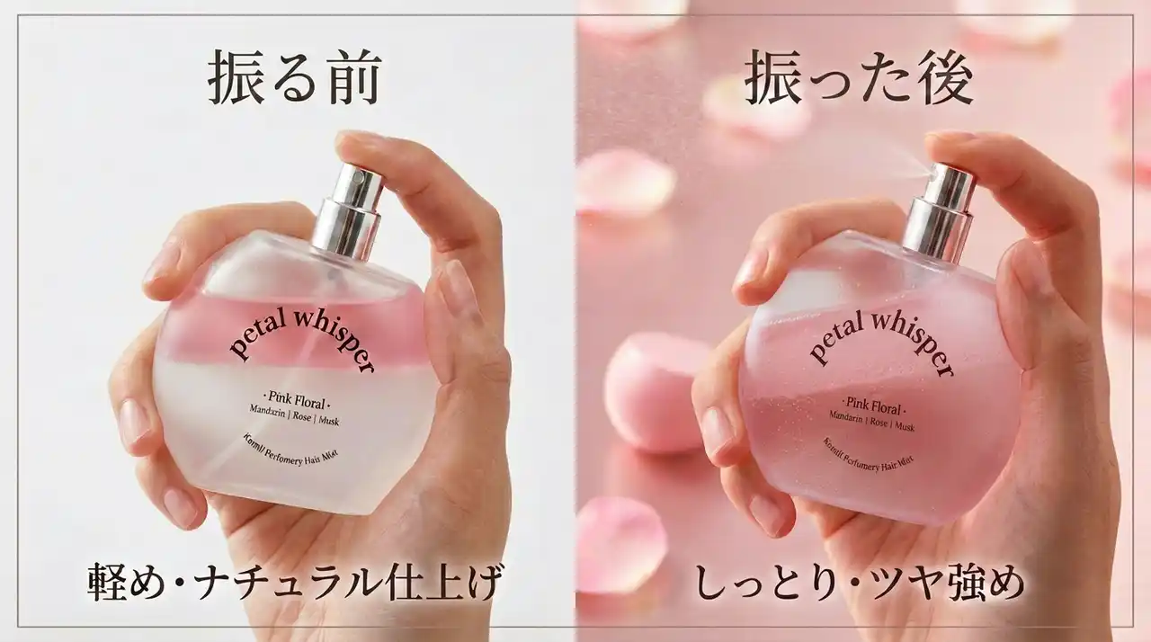 2層式の「パフューマリーヘアミスト ペタルウィスパー」は、シーンに合わせて仕上がりを楽しめるのも魅力です。 |