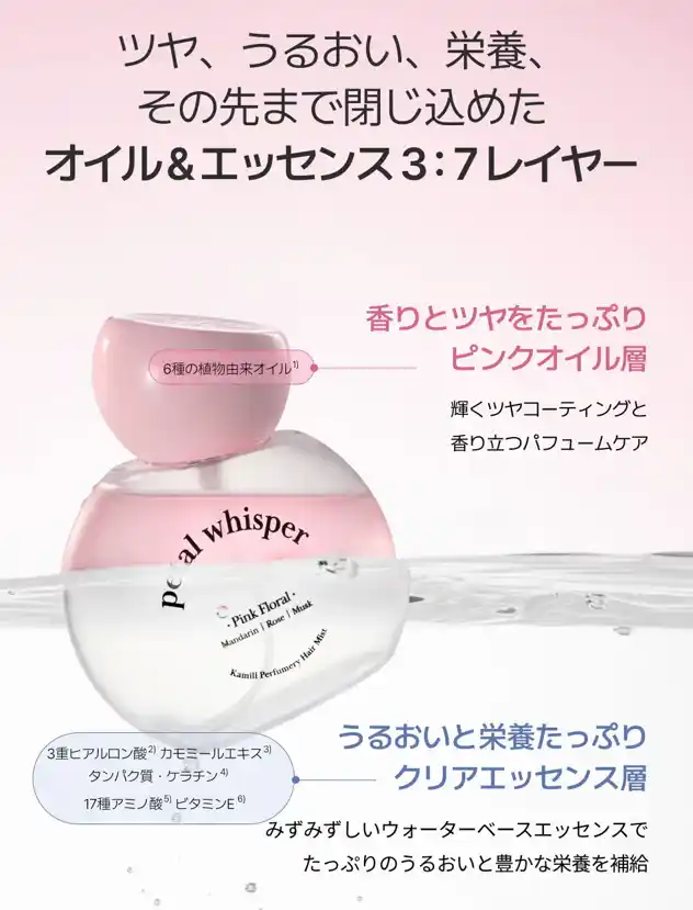 本製品はオイル層と美容エッセンス層からなる2層式処方を採用したヘアミスト。髪に自然なツヤとうるおいを与えながら、まるで香水のようにふんわりと広がる、やさしく華やかな香りを楽しめる1本です。 |