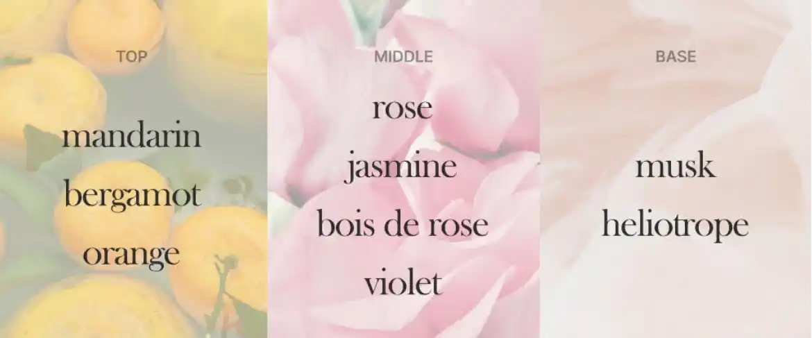 花びらに染み込んだシトラス、さわやかなピンクフローラルの香り、 さわやかなマンダリンが伝える清涼感、ローズが残す優雅さ、そしてムスクが包み込む暖かい余韻。 まるで花びらがささやくように、甘美な香りが深く染み込み、あなたの日常にリフレッシュを与えます。 |