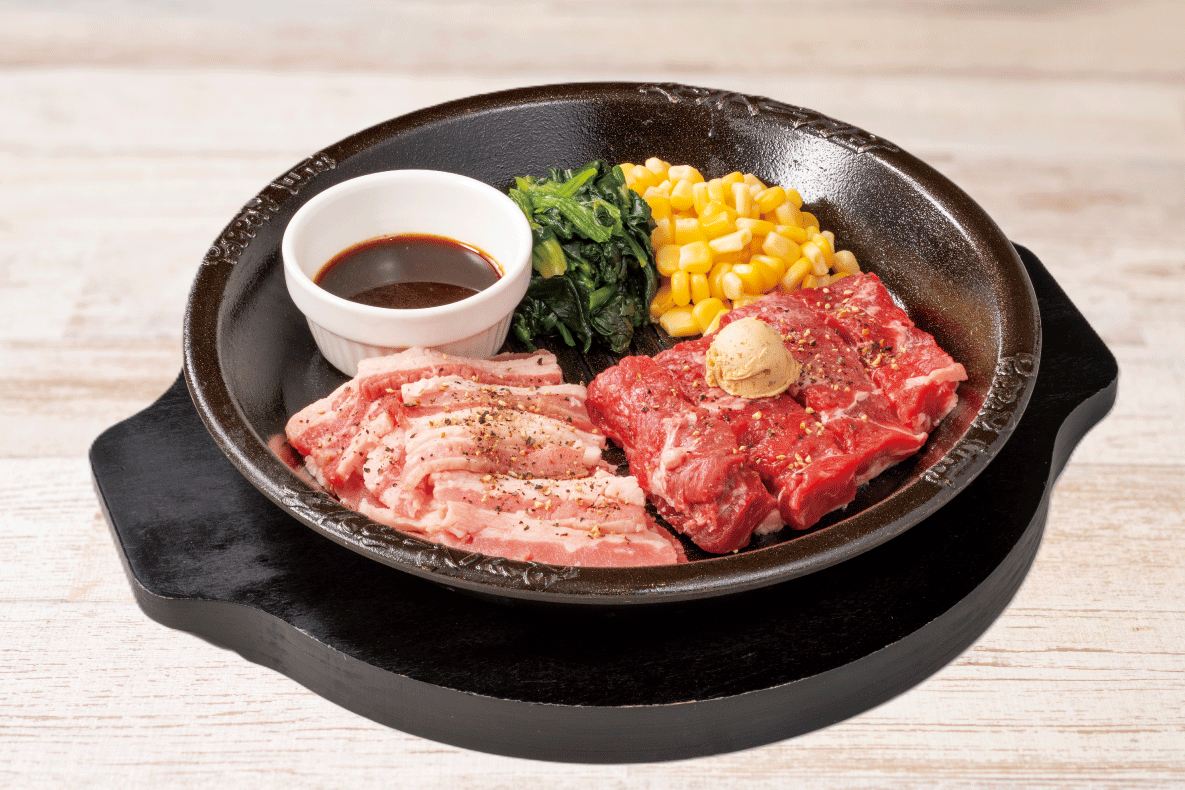 トッピングでは、大人気のチーズがクワトロチーズへと進化。チェダー、ゴーダ、サムソ、モッツァレラの4種をブレンドしたチーズです。そのほか、さつまいもやほうれん草のトッピングも新たに登場。鉄皿でソテーされたほうれん草が、お肉の旨みを引き立てます。 |