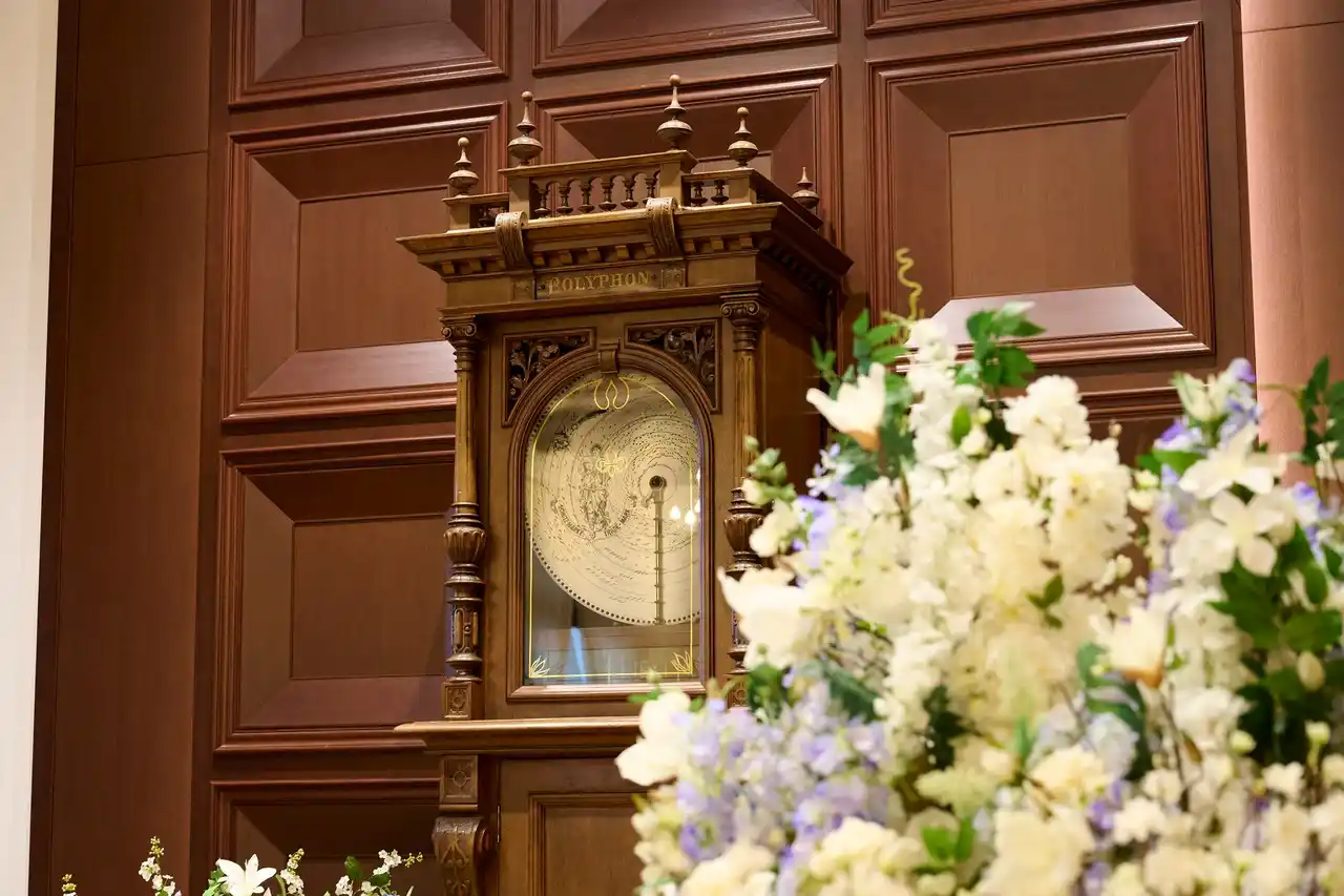 | 今回のリニューアルでは、「花御殿」にちなんだ“花”をテーマに、装花はすべて花御殿で使用されている花々のみで構成。クラシカルな重厚感を残しながら、現代のトレンドを取り入れた装花へと刷新いたしました。時を重ねた空間に調和しつつ、未来へと希望や笑顔が「咲く」ような、やわらかく華やかな印象を演出しております。また、祭壇の中心には約120 年の時を刻んできたオルゴールを設置。今後の挙式では、新郎新婦ご自身の手でオルゴールを鳴らしていただくセレモニーを取り入れてまいります。受け継がれてきた音色に、おふたりの新たな一歩を重ねる瞬間は、「咲く、つむぐ New Vintage」を象徴する特別なひとときとなります。 | |||||||||