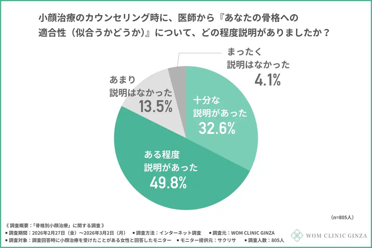 「小顔治療のカウンセリング時に、医師から『あなたの骨格への適合性(似合うかどうか)』についてどの程度説明がありましたか」と尋ねたところ、約8割が『十分な説明があった(32.6%)』『ある程度説明があった(49.8%)』と回答しました。 |