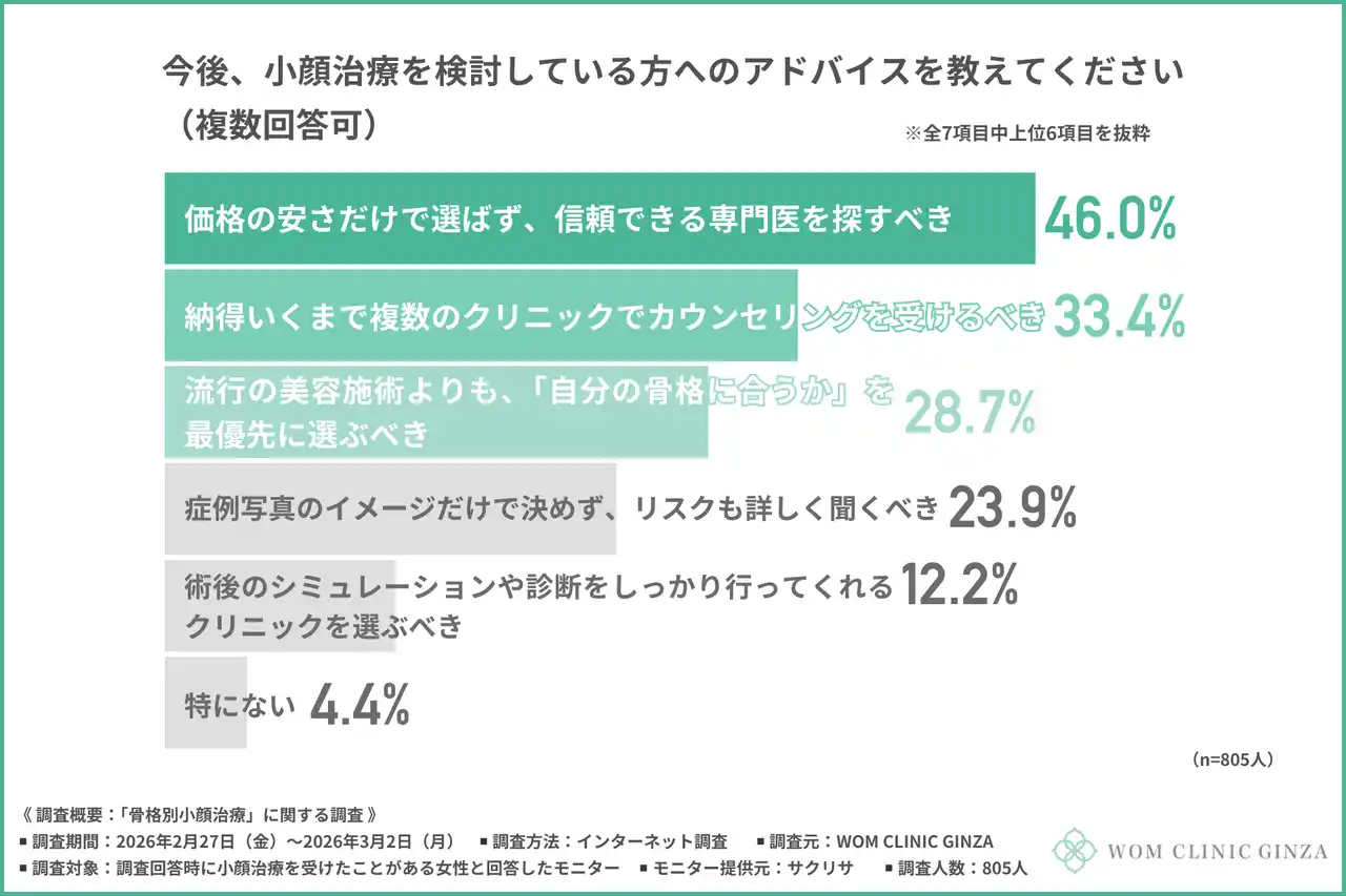 「今後、小顔治療を検討している方へのアドバイス」について尋ねたところ、『価格の安さだけで選ばず、信頼できる専門医を探すべき(46.0%)』と回答した方が最も多く、『納得いくまで複数のクリニックでカウンセリングを受けるべき(33.4%)』『流行の美容施術よりも、「自分の骨格に合うか」を最優先に選ぶべき(28.7%)』と続きました。 |