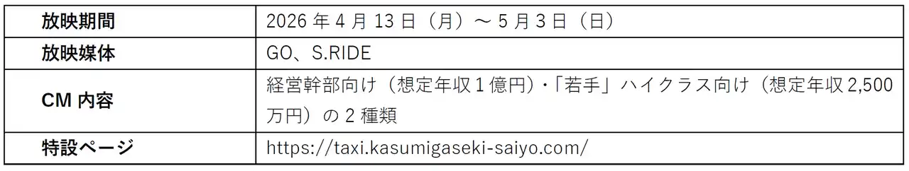 あわせて、本採用の認知拡大を目的として、2026年4月13日(月)から5月3日(日)まで、タクシーサイネージ広告( GO 、S.RIDE)にてCMの放映を開始いたします。 |