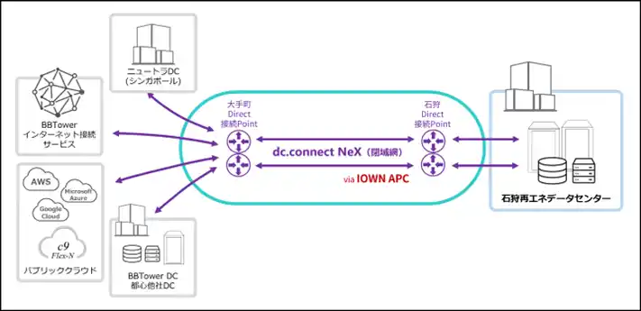 本サービスは、石狩再エネデータセンターをご利用の各企業・団体への提供はもとより、同データセンターが提携する「ニュートラDCシンガポール」(NeutraDC Singapore: シンガポールを拠点に、高性能かつ高信頼のデータセンターサービスを提供する事業者)との接続においても活用される予定です。これにより、地方データセンターを起点としながら、東京・大手町エリアを経由し、シンガポールをはじめとする海外拠点への接続が可能となります。国内外の主要データセンターと柔軟に接続できる環境を整備することで、グローバル展開を視野に入れたサービス基盤の構築を支援します。 |