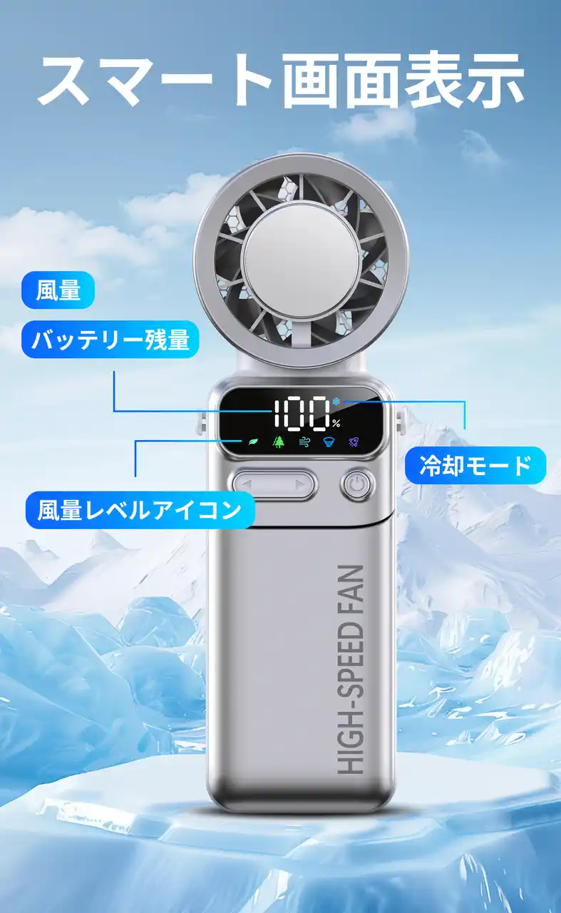 1から100まで、指先ひとつで細かくコントロール。さらに20/40/60/80/100の5段階モードも搭載。「+」「-」ボタンを長押しすればなめらかに変化し、シーンに合わせて最適な風を選べます。 |