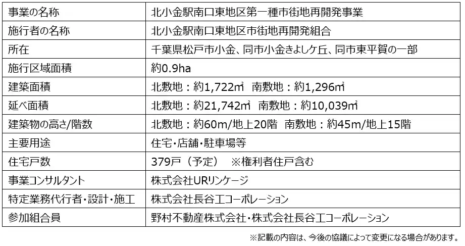 北小金駅南口東地区市街地再開発組合(理事長:鈴木悦朗 以下、本組合)と本組合に参加組合員として参画している野村不動産株式会社(本社:東京都港区/代表取締役社長:松尾大作)、株式会社長谷工コーポレーション(本社:東京都港区/代表取締役社長:熊野聡)は、千葉県松戸市にて進めております「北小金駅南口東地区第一種市街地再開発事業(以下、本事業)」において、2026 年4 月1 日に着工しましたことをお知らせいたします。 |