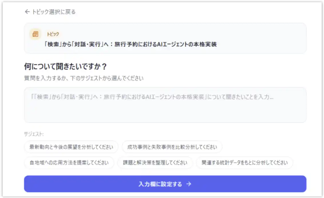 テーマや相談内容をクリックするだけでAIに相談しながら観光戦略を作成。「初めてで何をどう聞いていいか分からない」ような方でも簡単に観光戦略の作成や地域DMOに取り組めます。 |