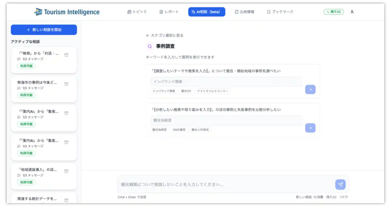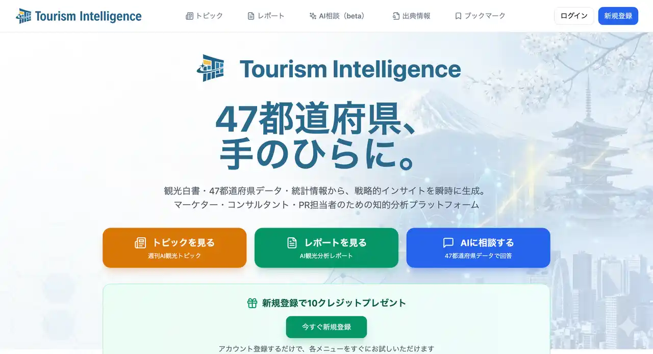 Tourism Intelligenceへの新規登録で10クレジットを無料プレゼントしています。AI相談をはじめ、各種機能をすぐにお試しいただけます。 |