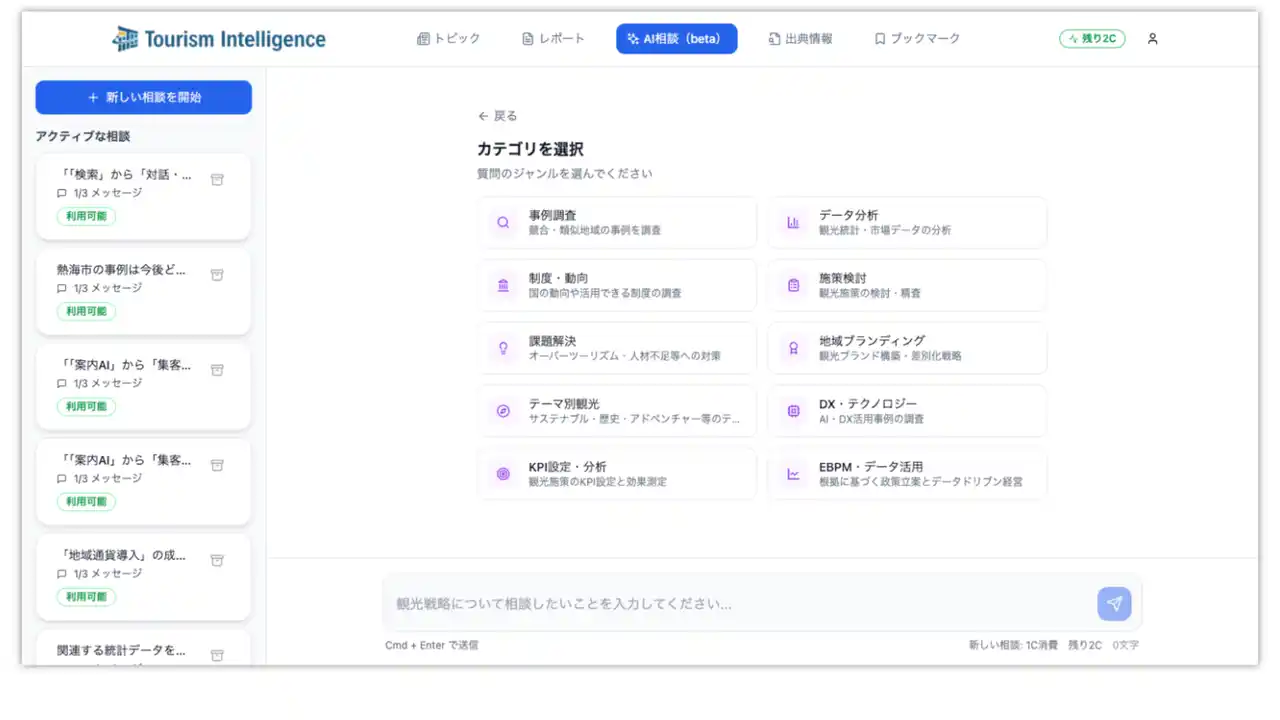 Tourism Intelligenceは、47都道府県の観光データと国の統計情報をAIが横断分析する、観光ビジネス向けの情報・分析プラットフォームです。「AI相談」「テーマ別AIレポート」「週次トピック配信」の3つの機能で、案件ごとのリサーチから提案資料のベース作成までを支援します。 |