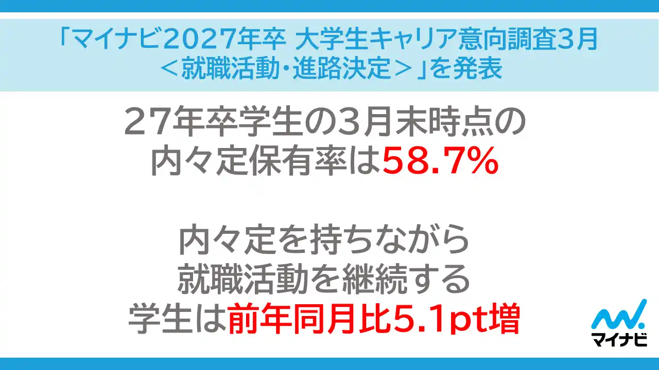 株式会社マイナビ(本社:東京都千代田区、代表取締役 社長執行役員:粟井俊介)は、2027 年卒業予定の全国の大学生、大学院生を対象に実施した、「マイナビ2027年卒大学生キャリア意向調査3月<就職活動・進路決定>」の結果を発表しました。 |