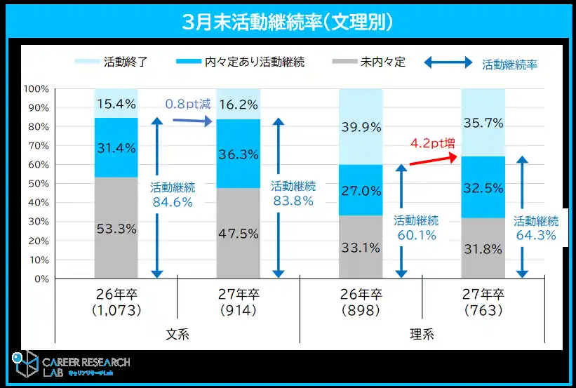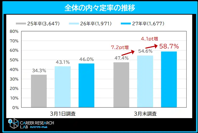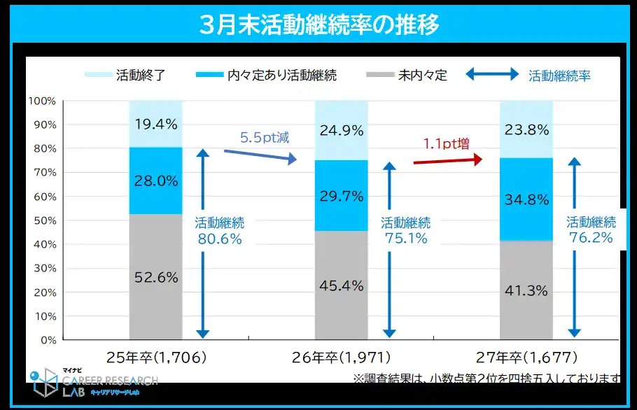 27年卒学生の3月末時点の内々定保有率は58.7%。内々定を持ちながら就職活動を継続する学生は前年同月比5.1pt増。未内々定者と合わせた活動継続率は76.2%