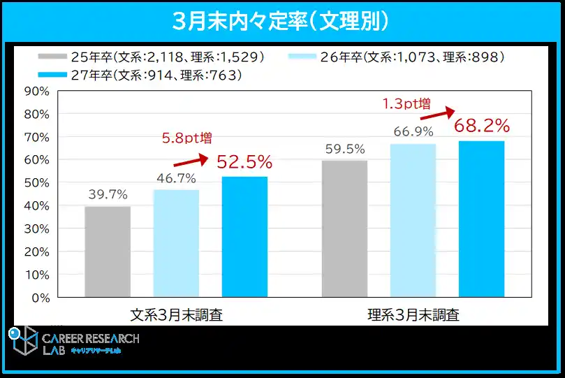 2027年卒学生の3月末の内々定保有率は、前年同月から4.1pt増加し、58.7%だった。3月1日調査時点では46.0%で、約1カ月で12.7pt増となった。文理別で見ると、文系学生は52.5%(前年同月比5.8pt増)、理系学生は68.2%(前年同月比1.3pt増)と、理系学生の方が高いが、前年同月比の上り幅は、文系学生の方が理系学生よりも大きい。【図1、2】 |