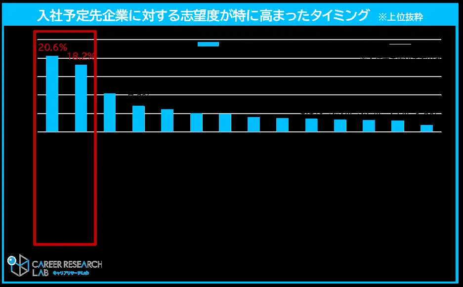 現時点で入社意思がもっとも高い企業を発見したきっかけを聞くと、「就職情報サイト(15.7%)」が最多で、次いで「仕事体験(就業体験ができる短期間プログラム)(14.9%)」、「インターンシップ(5日間以上のプログラム)(13.2%)」となった。また、入社予定先を決めている学生に、志望度が特に高まったタイミングを聞いたところ、「インターンシップ(5日間以上)(20.6%)」がもっとも多く、次いで、「仕事体験(18.2%)」となった。インターンシップ等のキャリア形成プログラムが、学生の内々定先への入社意思や入社予定先の決定に大きな影響を与えていることがわかる。【図5、6】【図5】