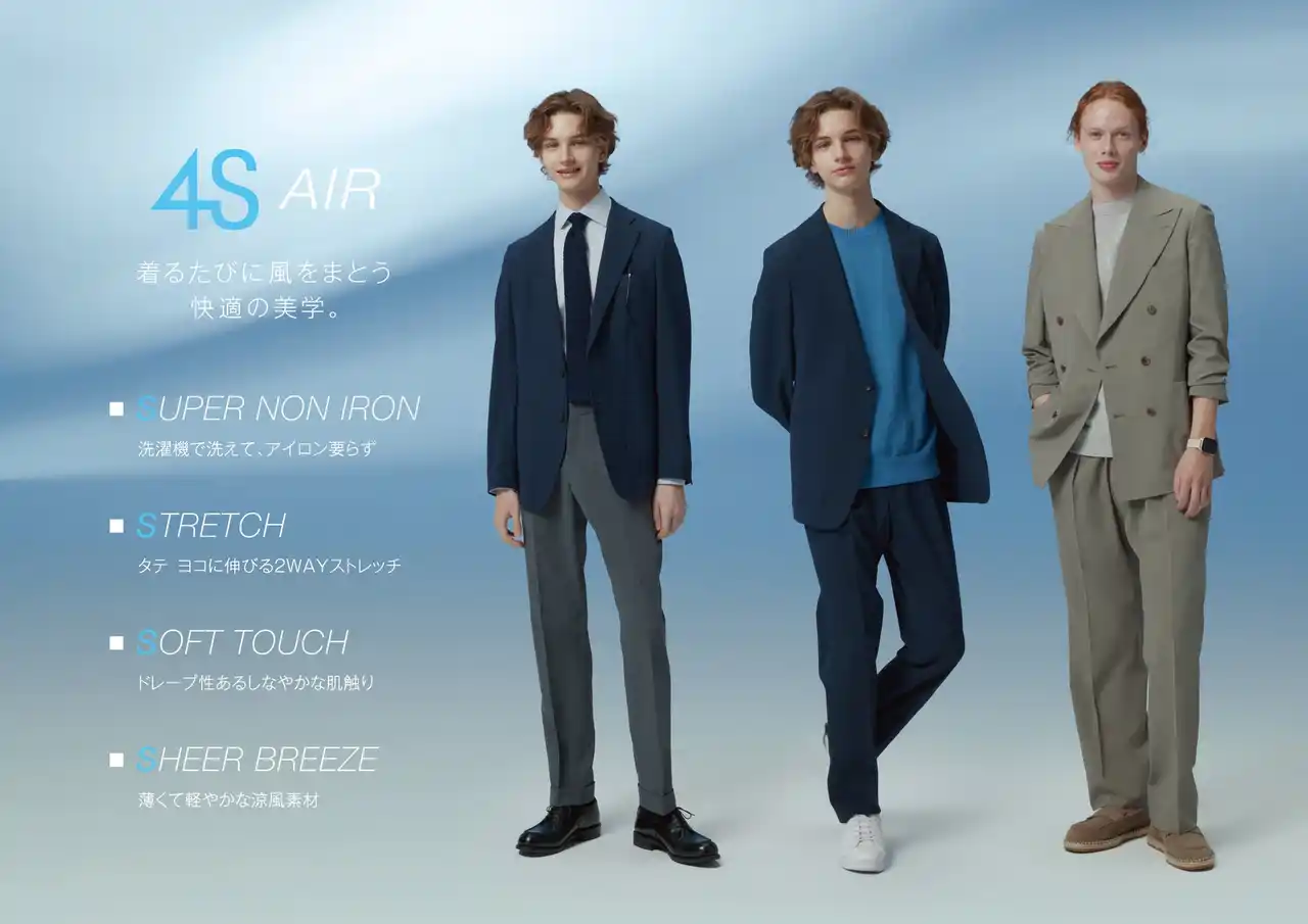 株式会社コナカ(本社:神奈川県横浜市、代表取締役社長CEO:湖中謙介)がリアルスーツをコンセプトに展開している「SUIT SELECT(スーツセレクト)」は、近年の記録的な猛暑、持続的な暑さに対応した新商品シリーズ「4S AIR(フォーエス エアー)」(以下、「4S AIR」)を2026年4月16日(木)に発売を開始し、順次アイテムを拡大いたします。 |