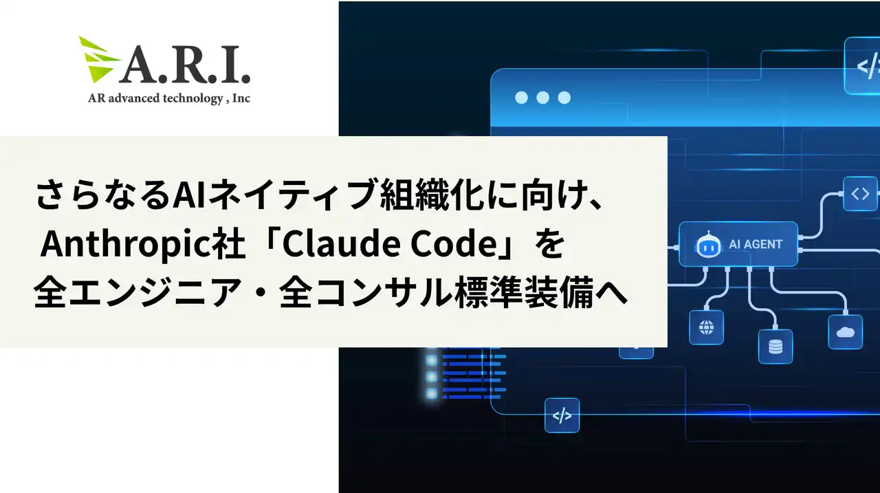 ARアドバンストテクノロジ株式会社(本社:東京都渋谷区、代表取締役社長:武内 寿憲、以下ARI)は、組織全体のAIネイティブ化に向け、Anthropic社が提供するAIエージェント「Claude Code, powered by Anthropic(以下Claude Code)」を、全エンジニアおよび全コンサルタントの標準ツールとして全社導入を開始したことをお知らせいたします。 |