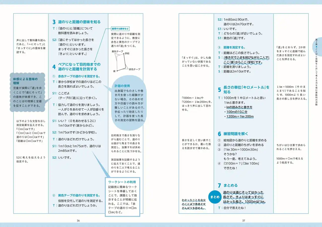 「たし算・ひき算」「九九」「分数」「長さ」「平均」といった主要な単元について、小学1年生から6年生までの具体的な授業実践事例を12本収録しています。それぞれの事例では、JSL児童が算数の概念を視覚的に捉え、体験を通して理解を深められるよう、具体的な声かけや教具の活用法を詳細に解説。子どもたちの「これができる!」という成功体験を積み重ね、自ら考える力を育むためのステップを明確に示しています。また、「指導の流れ」には、注釈のように「ふきだし」がついています。