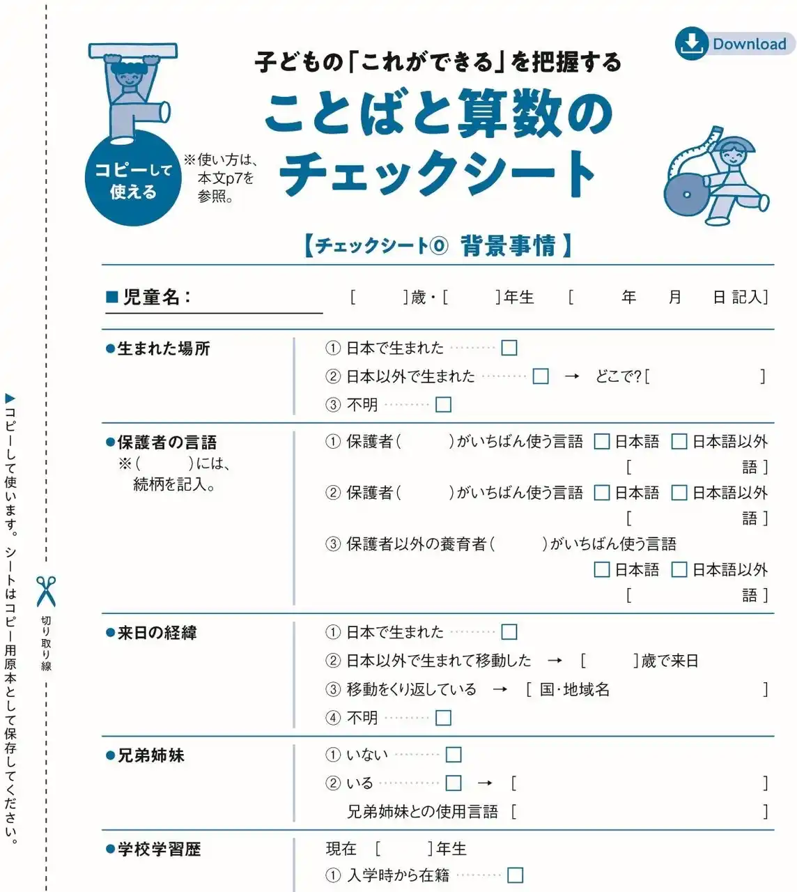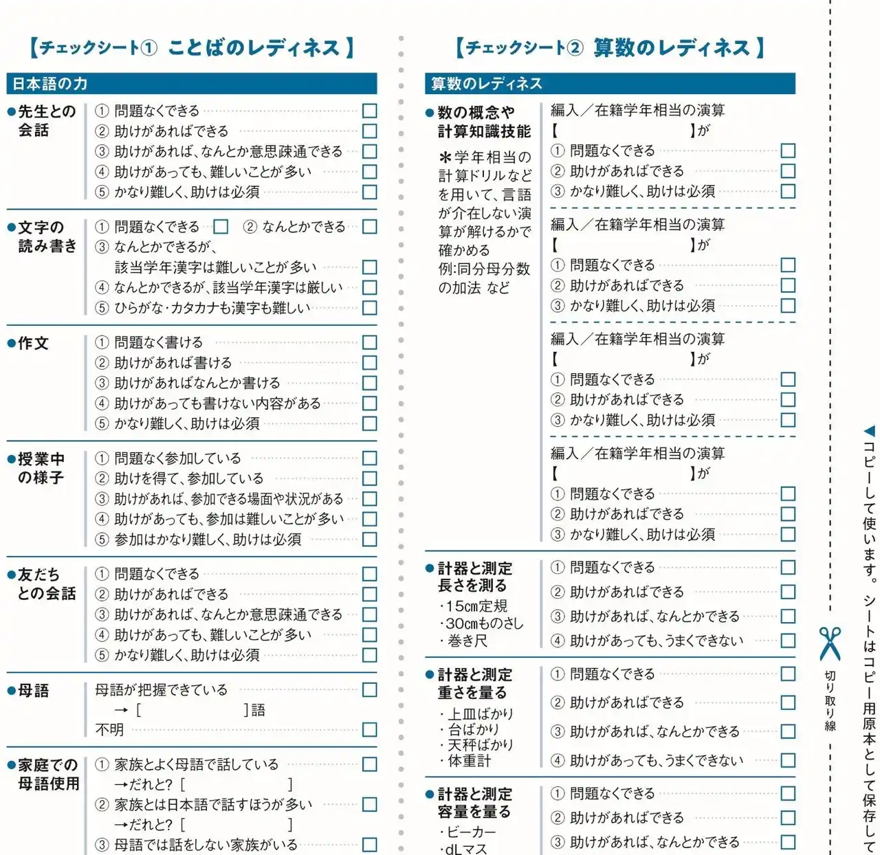 本書の巻末には、子どもの日本語と算数に関して理解できていることを多角的に把握するための「ことばと算数のチェックシート」を収録しています。このシートを活用することで、JSL児童の日本語力(会話、読み書き、授業参加など)と、算数力(計算、計測、図形など)の現状を詳細に分析。先生や支援員は、一人ひとりの子どもの強みや課題を正確に把握し、個別最適化された支援計画を立てることが可能になります。コピーして繰り返し使えるため、継続的な子どもの成長記録としても活用できます。 |