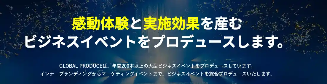 「株式会社グローバルプロデュース」は、「イベントプロデュースを通じて世界中に幸せを届ける」ことをビジョンに掲げる、総合イベントプロデュースグループ。単なる手配屋としてではなく、お客様の想いをイベントというカタチにし、実施効果を最大化するためのお手伝いをさせていただいています。「日本発、世界へ通用するイベントプロデュースの提供」を目指し、皆様にとって最高のクリエイティブやサービスを提供します。 |