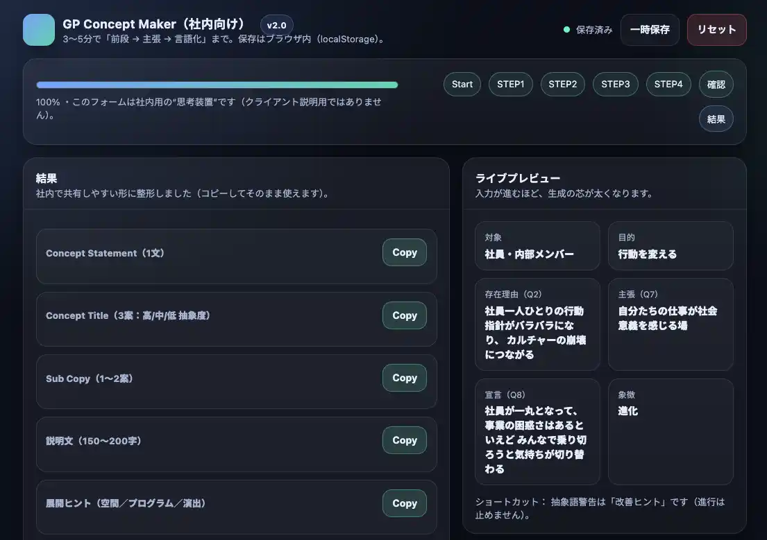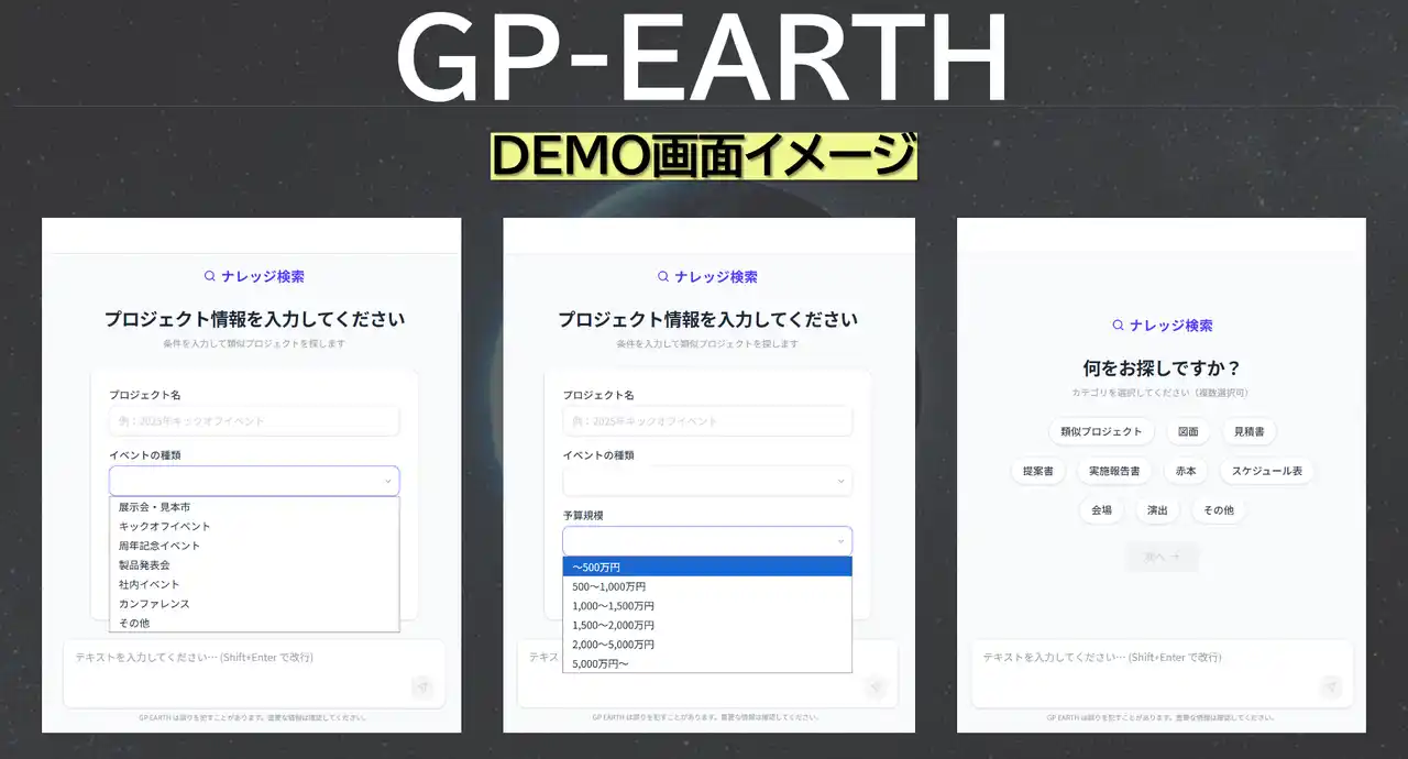GP EARTHは、一度に完成形を目指すのではなく、段階的に機能を拡張していく設計思想をとっています。まずは企画書の骨子やコンテンツページを効率的に生成する基盤を構築し、次に全体スケジュール・制作スケジュール・体制図・見積りなどを含む実施計画書の自動生成へと拡張。最終的には、過去の実績データをもとにプログラム設計の根拠と効果予測を提示できる、イベントプロデュースの「専門家」としての機能を目指します。 |