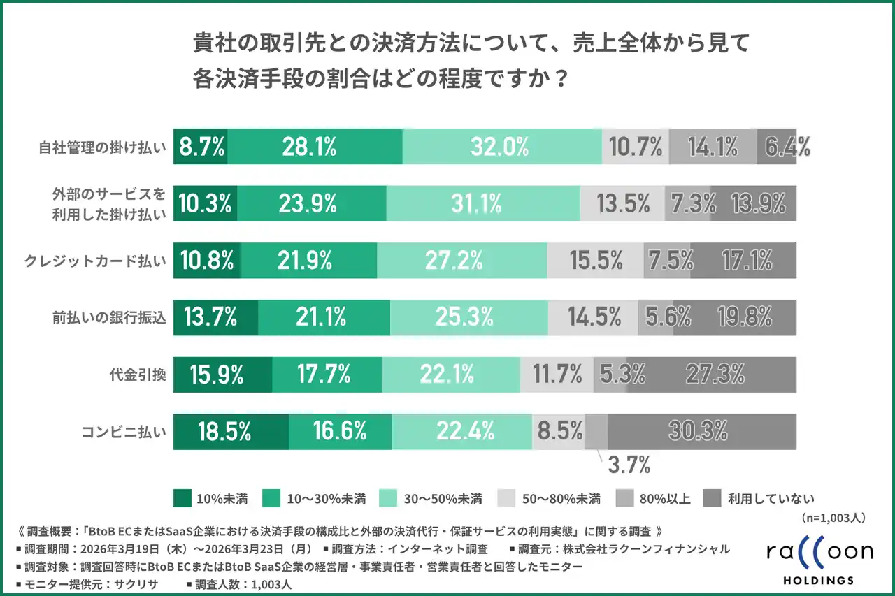 株式会社ラクーンフィナンシャル(所在地:東京都中央区、代表取締役社長:秋山 祐二)は、BtoB ECまたはBtoB SaaS企業の経営層・事業責任者・営業責任者を対象に、「BtoB ECまたはSaaS企業における決済手段の構成比と外部の決済代行・保証サービスの利用実態」に関する調査を行いました。 |