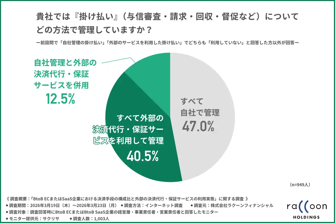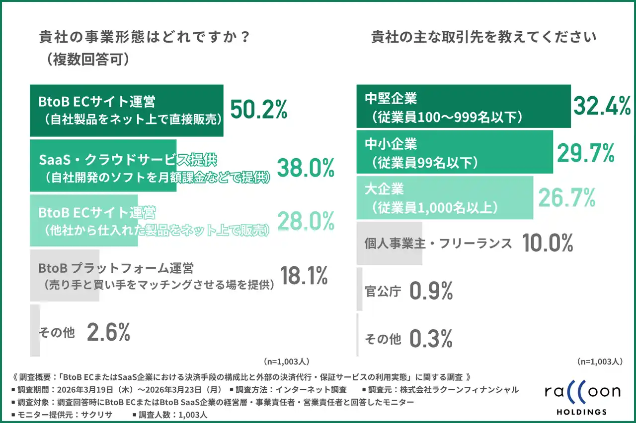 そこで今回、株式会社ラクーンフィナンシャルは、BtoB ECまたはBtoB SaaS企業の経営層・事業責任者・営業責任者を対象に、「BtoB ECまたはSaaS企業における決済手段の構成比と外部の決済代行・保証サービスの利用実態」に関する調査を行いました。 |
