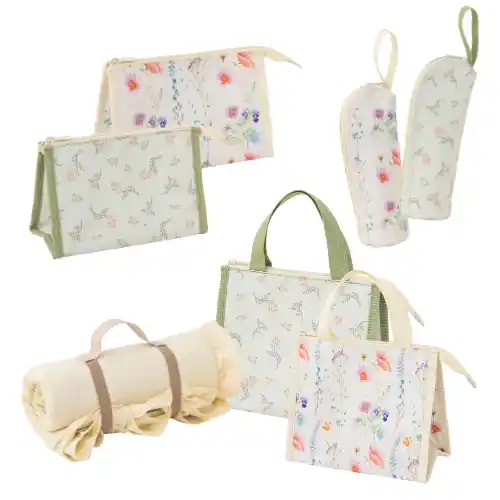 繊細なタッチで描かれた可憐な花柄のランチバッグ。落ち着いたセージグリーンと柔らかなアイボリーが大人かわいいピクニック空間を演出してくれます。 |