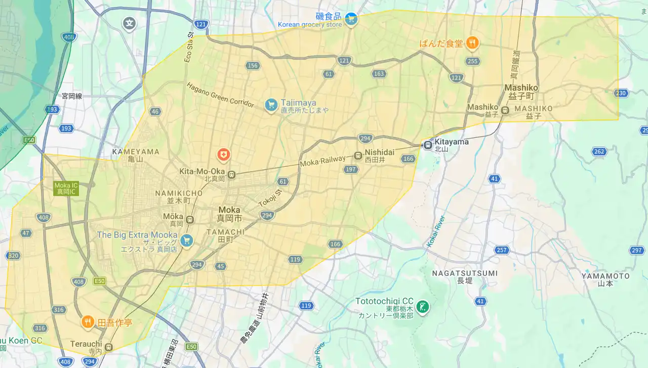 栃木県:益子町、大田原市、矢板市、真岡市(黄色部分。青色部分は既存提供エリア) |