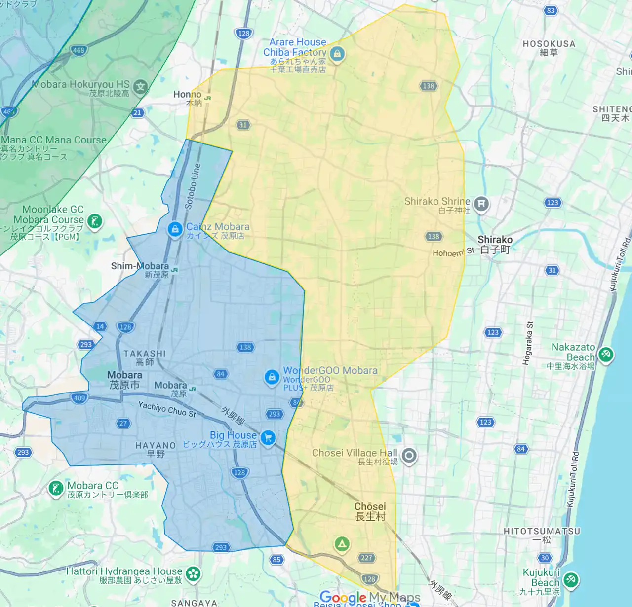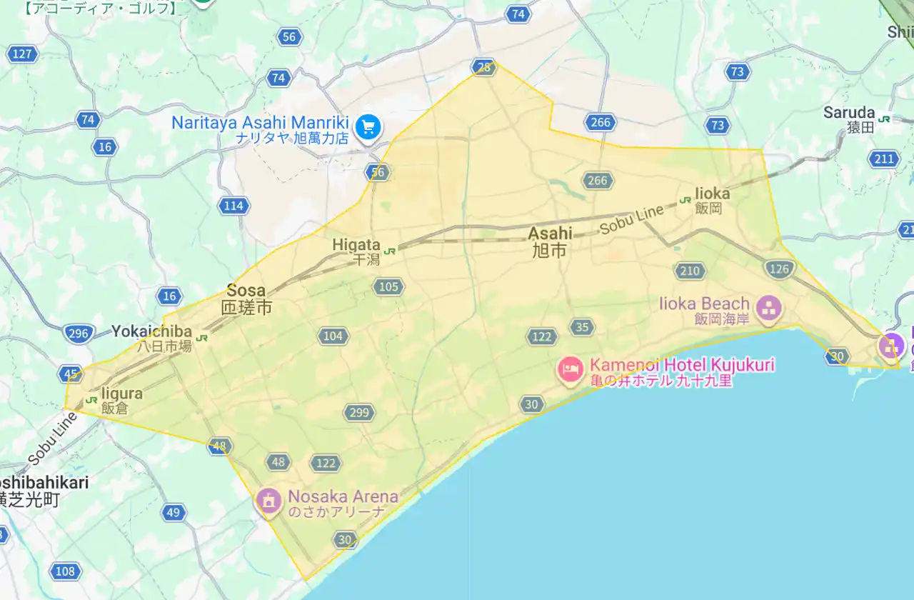 千葉県:旭市、白子町、匝瑳市(黄色部分。青色部分は既存提供エリア) |