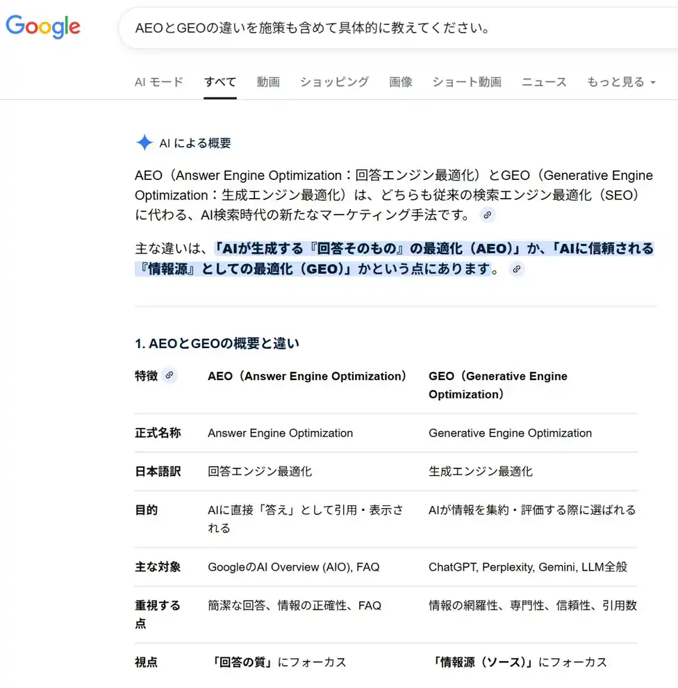 | 引用:主な違いは、「AIが生成する『回答そのもの』の最適化(AEO)」か、「AIに信頼される『情報源』としての最適化(GEO)」かという点にあります。 | |||