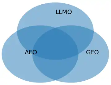 | つまり、以下で示すAEO、GEO、LLMOは別施策であり、なおかつこの概念の下、体系的にとらえることで統合する設計思想であるAIO(個別施策ではない)の全体像が見えてきます。それが以下の図です。 | |||