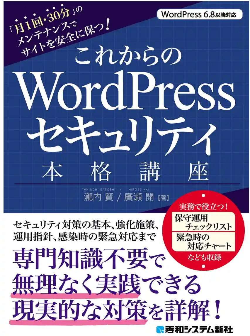 | 最後に、当社(株)セブンアイズ 代表取締役 瀧内賢が書いた『これからのWordPressセキュリティ本格講座: 「月1回・30分」のメンテナンスでサイトを安全に保つ! (秀和システム新社)』という執筆書籍も4月14日に発売予定です。WPセキュリティに関するご相談も対応可能です(※こちらは有料対応で、上記の50社様限定案内とは別です)。 | |||