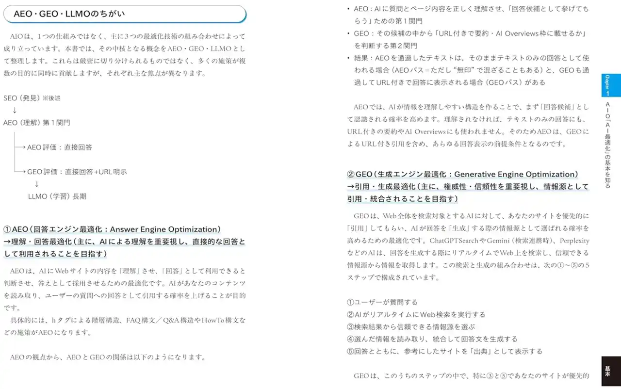 この関係は、サッカーのチーム戦術にたとえると分かりやすいです。AEO・GEO・LLMOのそれぞれには、主な役割がありますが、同時に互いに補い合って機能します。たとえば、サイドバックというポジションは守備が主な役割ですが、試合の流れによって攻撃にも参加します。 同じように、AEOが中心になっていても、GEO的な表現設計やLLMO的な構造設計が必要になることがあります。つまり、それぞれが独立して存在しているわけではなく、チームとして重なり合いながらAIに最適化された成果を生み出すのです。 【書籍紹介動画1.】 |
