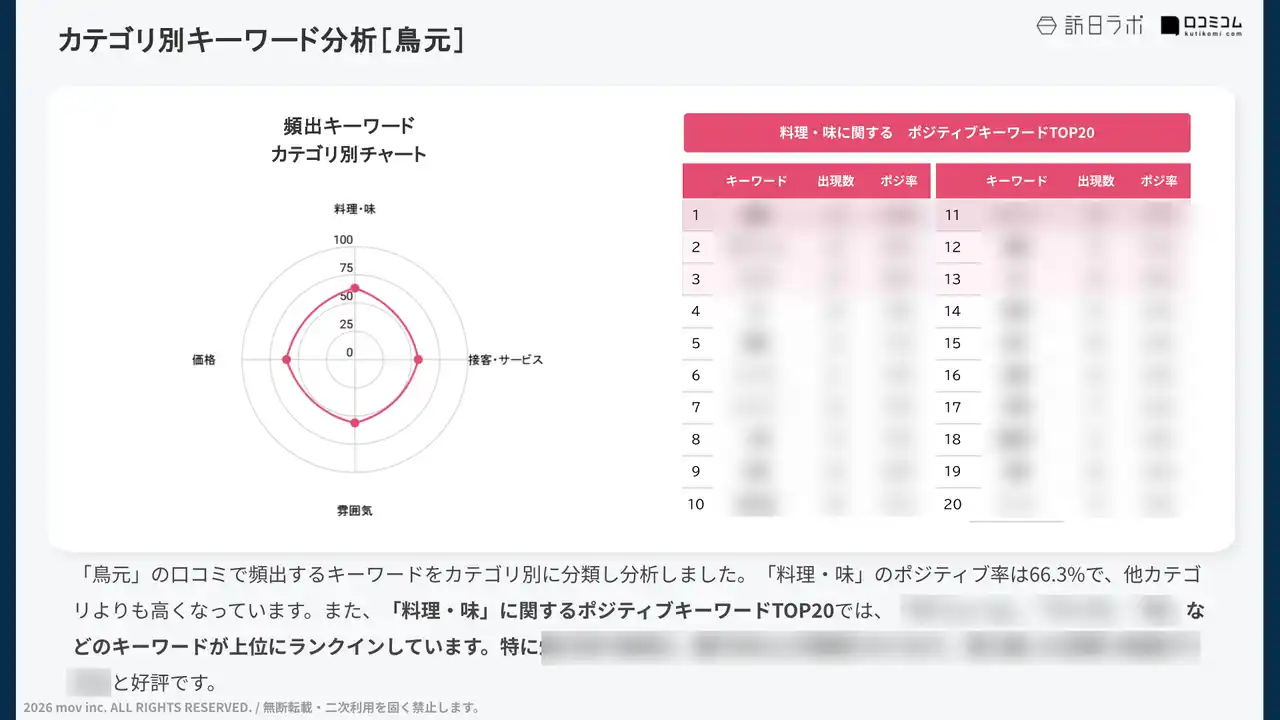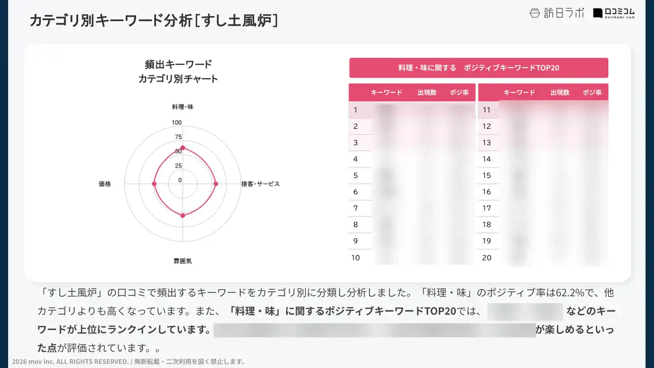 また。両ブランドの口コミに頻出するキーワードをカテゴリ別(料理・味 / 雰囲気 / 価格 / 接客・サービス)に分析し、「料理・味」のカテゴリでのポジティブキーワードTOP20も発表しています。 |