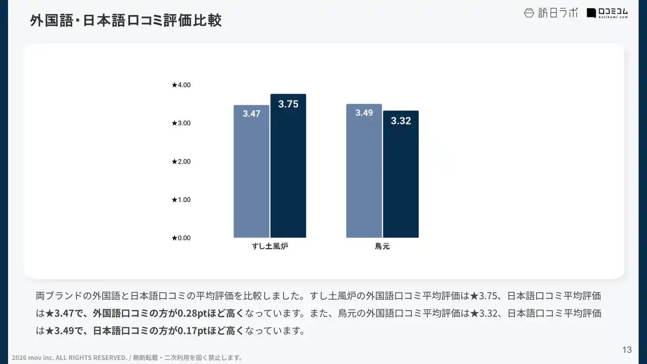 両ブランドの日本語口コミと外国語口コミの平均評価を比較したところ、「すし土風炉」では、日本語の口コミ平均評価★3.47に対し、外国語では★3.75と外国語の方が0.28ポイント高い評価を獲得していました。 |