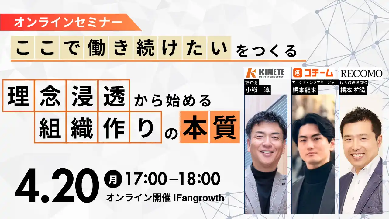 「人の可能性・価値を最大に広げる社会を創る」をミッションに掲げ、理念を軸とした組織づくりを支援するプロフェッショナル集団。経営者と二人三脚で、理念の策定から人事戦略の立案、実行体制の整備まで一気通貫でサポートする「RECOMO X」や、次世代のCHROを育成する「CHROカレッジ」を展開。経営戦略と組織・文化を高度に同期させ、企業の持続的な成長を実現しています。 |