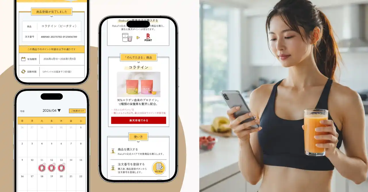 「RakuFit」は、累計販売台数5.2万台、MAU3.8万人(2026年3月実績)を誇る、楽天経済圏の美容・健康意識の高いユーザーが毎日利用する健康管理アプリです。本プログラムでは、ユーザーの健康活動中にダイレクトにアプローチすることで、商品の飲用習慣化を強力にサポートします。 |