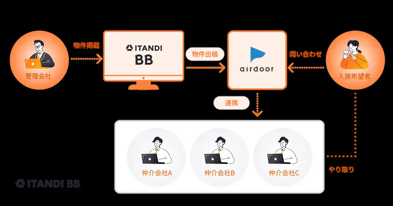 テクノロジーで不動産取引をなめらかにするイタンジ株式会社(以下「当社」)は、2026年4月より、当社が提供するリアルタイム不動産業者間サイト「ITANDI BB」と、株式会社エアドア(以下「エアドア社」)が提供するダイレクト賃貸検索サービス「airdoor」(以下「エアドア」)の連携を開始しました。これにより、エアドアとの連携を希望する賃貸不動産管理会社(以下「管理会社」)は、「ITANDI BB」に掲載している一都三県の物件情報を、エアドアに連携できるようになります。 |