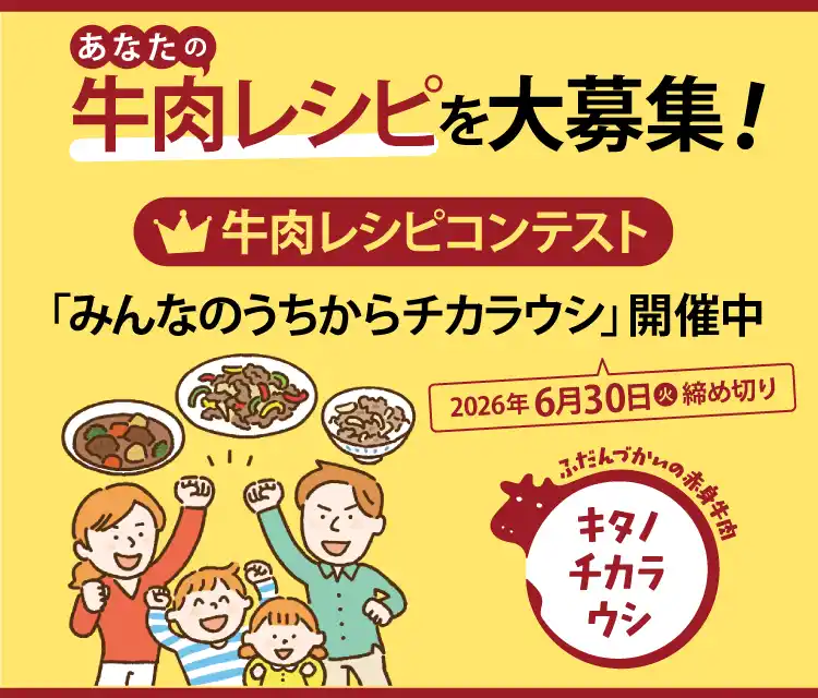 キタノチカラウシの誕生にあわせて、この牛肉を使ったレシピコンテストを開催します。テーマは、牛肉の“ふだんづかい”。いつもの食卓で楽しんでいる工夫や、家族に人気の一品など、生活クラブの組合員自身の定番レシピを募集します。応募されたレシピは、各地の生活クラブ組合員が投票し、最優秀レシピ3つを選出します。また生産者・北海道チクレンによるチクレン賞も選出し、合計4名には生活クラブのギフトで大人気の「牛肉バラエティセット」をプレゼントします。 |