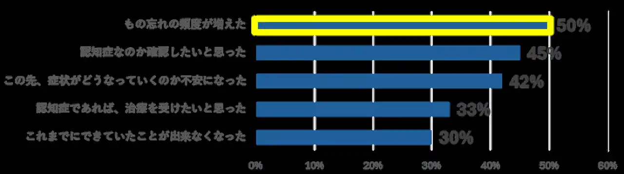 当事者/ご家族に「記憶力(もの忘れ)や思考力(理解・判断力)の変化(低下)」について医療機関を受診したきっかけを質問したところ、「もの忘れの頻度が増えた」が最も多く、50%が回答しました。“もの忘れ”はアルツハイマー病を発見する重要な要素といえます。 |