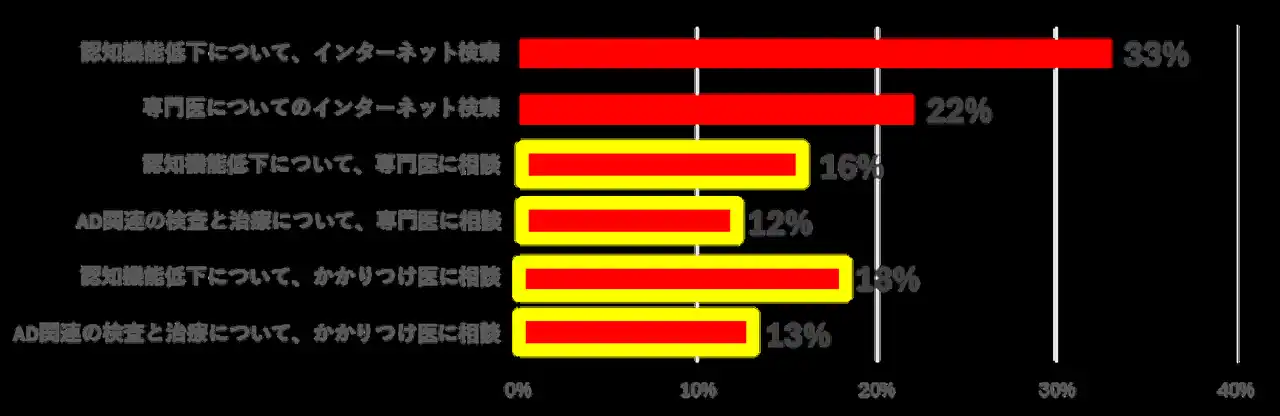 未受診の方/ご家族に「記憶力(もの忘れ)や思考力(理解・判断力)」の問題に関して、過去3か月以内に行った、今後3か月以内に行おうと思うことを質問したところ、「医師に相談」と回答が2割未満でした。 “もの忘れ”の原因がアルツハイマー病かもしれないと認識していても、未受診の方/ご家族は医師への相談に消極的なようです。 |
