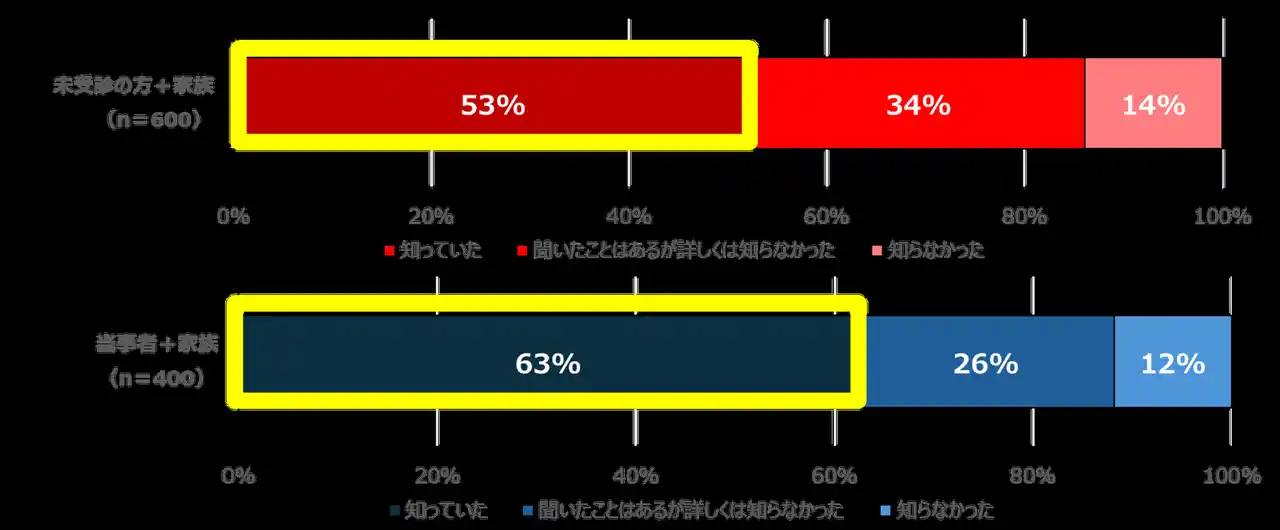しかし、当事者/ご家族の約半数が、“もの忘れ”の頻度が増えたことで医療機関を受診しており、“もの忘れ”はアルツハイマー病を発見する重要な要素といえます。また、受診の有無に関わらず、アルツハイマー病の原因の1つである「アミロイドβ」やその治療薬である「抗アミロイドβ抗体薬」に対する認知度が低いことも示されました(詳細な結果は参考資料をご参照ください)。 |