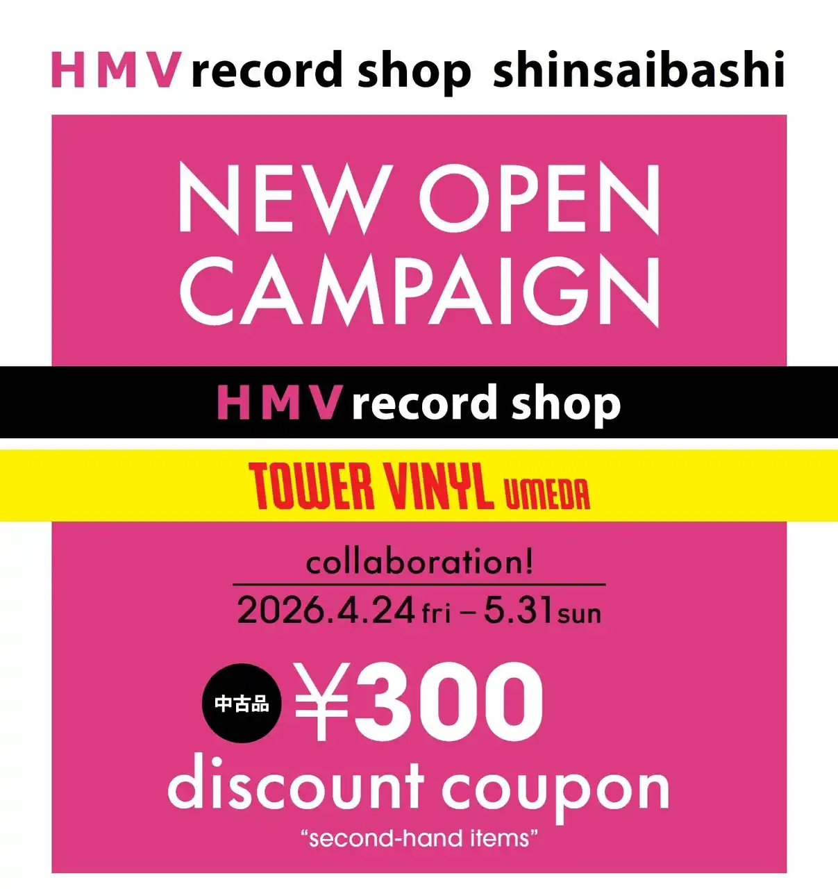 | オープン記念企画 第2弾として、大阪・梅田「TOWER VINYL梅田店」とのお得なコラボキャンペーンを実施いたします。2026年4月24(金)~5月31日(日)までの期間、商品をお買い上げのお客さまに、中古商品3,000円(税込)以上のお買い物にご利用いただける「中古商品 300円OFFクーポン」をそれぞれの店舗でプレゼントいたします。「HMV record shop 心斎橋」では「TOWER VINYL梅田店」で使えるクーポンを、「TOWER VINYL梅田店」では「HMV record shop 心斎橋」で使えるクーポンをお渡しいたします。 | |||||||||